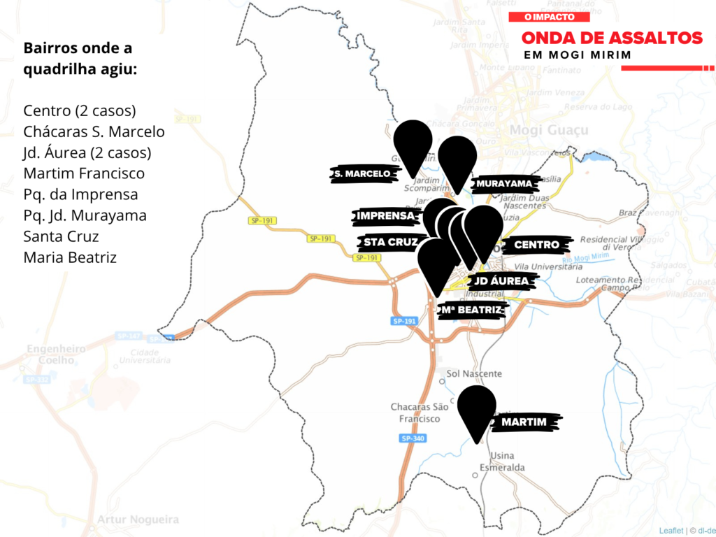 Em Mogi Mirim, as regiões afetadas pela série de roubos incluem o Centro da cidade e os bairros Santa Cruz, Parque Jardim Murayama, Jardim Áurea, Parque da Imprensa, Chácaras São Marcelo e o distrito de Martim Francisco. Crimes com características semelhantes também foram registrados em Mogi Guaçu e Itapira, embora em menor número, indicando abrangência regional da ação dos bandidos.