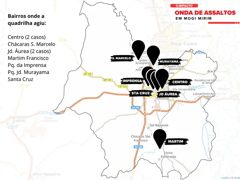 Somente em Mogi Mirim, foram nove ações criminosas já registradas, atingindo diversas regiões da cidade, no Centro e nos bairros Parque da Imprensa, Chácaras São Marcelo, Santa Cruz, Parque Jardim Murayama, Jardim Áurea e Martim Francisco.